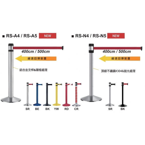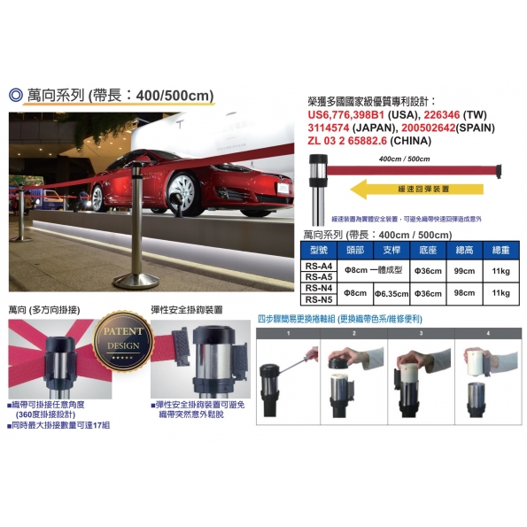 ♥萬向伸縮帶欄柱(400CM/500CM)♥ 【商品特色】 有效空間區隔,兼具高度安全性 織帶可掛接任意角度 同時掛接數量可達17組 安全掛鉤裝置可避免織帶意外鬆脫 【商品資訊】 本體規格: RSA4系列底座36cm 總高度:99cm RSA5系列底座36cm 總高度:99cm RSN4系列底座36cm 總高度:98cm RSN5系列底座36cm 總高度:98cm 繩長規格:400cm/500cm 注意事項:500cm僅提供紅和黑兩種色系的織帶